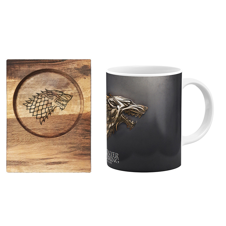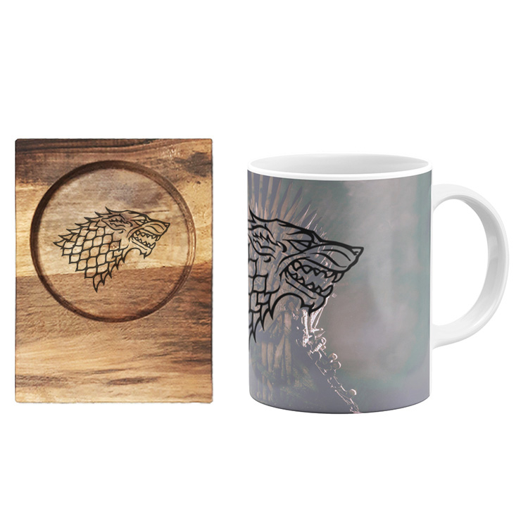 ماگ سرامیکی طرح گرگ به همراه زیرلیوانی چوبی